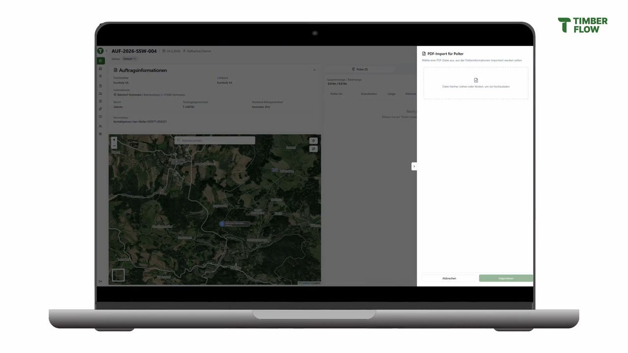 Fuhraufträge kommen per PDF oder als Ausdruck ins Büro. Timber Flow liest sie automatisch aus – Koordinaten, Mengen, Längen, Holzarten. Abtippen entfällt komplett.